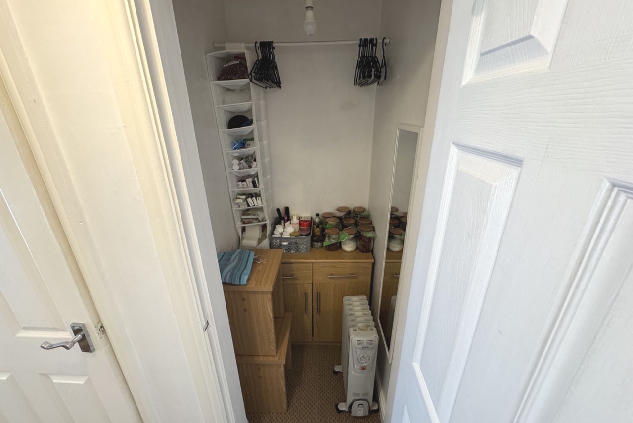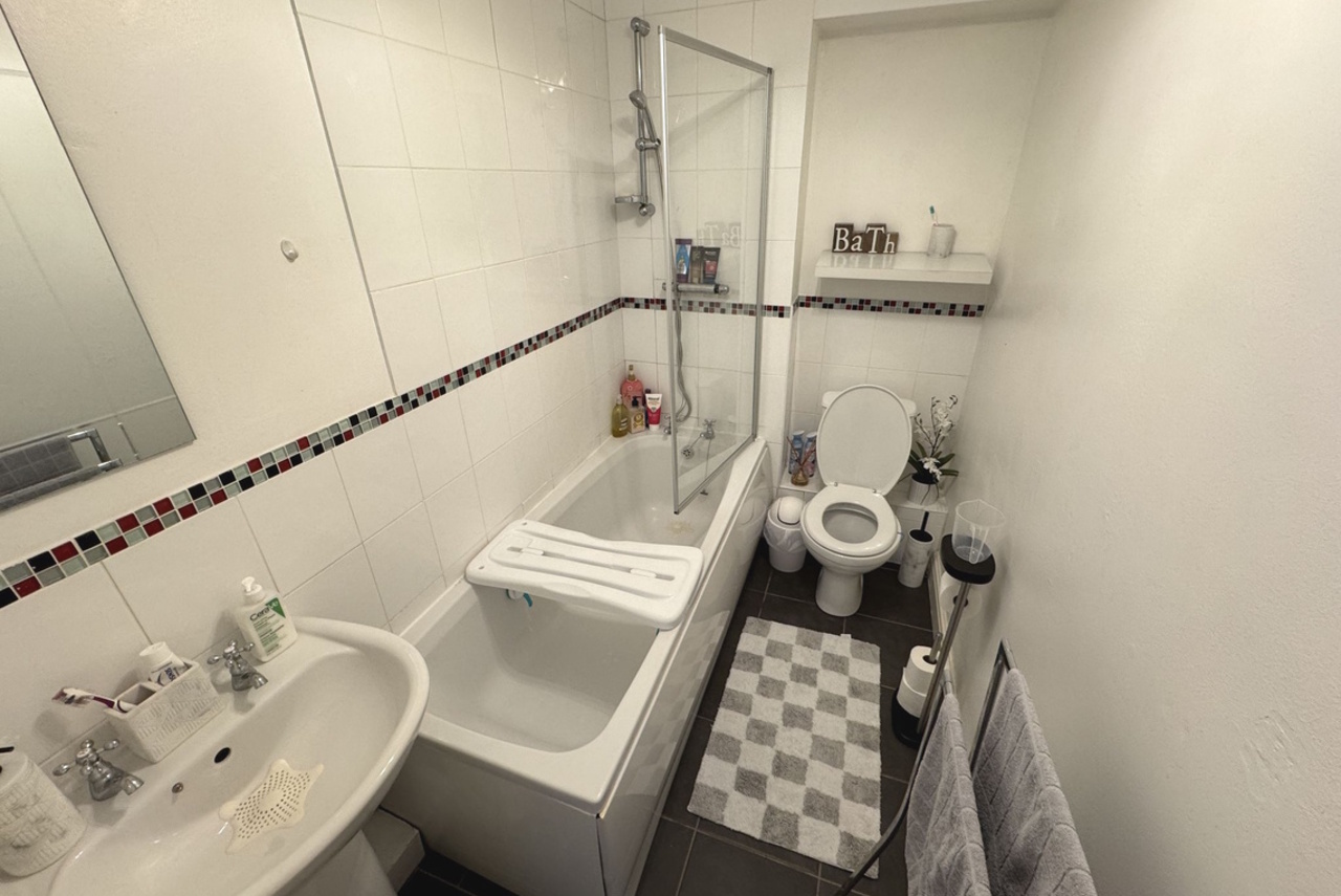 Fitted with a white three piece suite comprising: Panelled Bath with chrome mixer shower. Glazed Shower Screen. Pedestal Wash Basin. Low level W.C. Part tiled walls. Electric fan heater. Wall mounted extractor fan. Fitted cupboard with hot water cylinder / immersion heater. Panelled door.