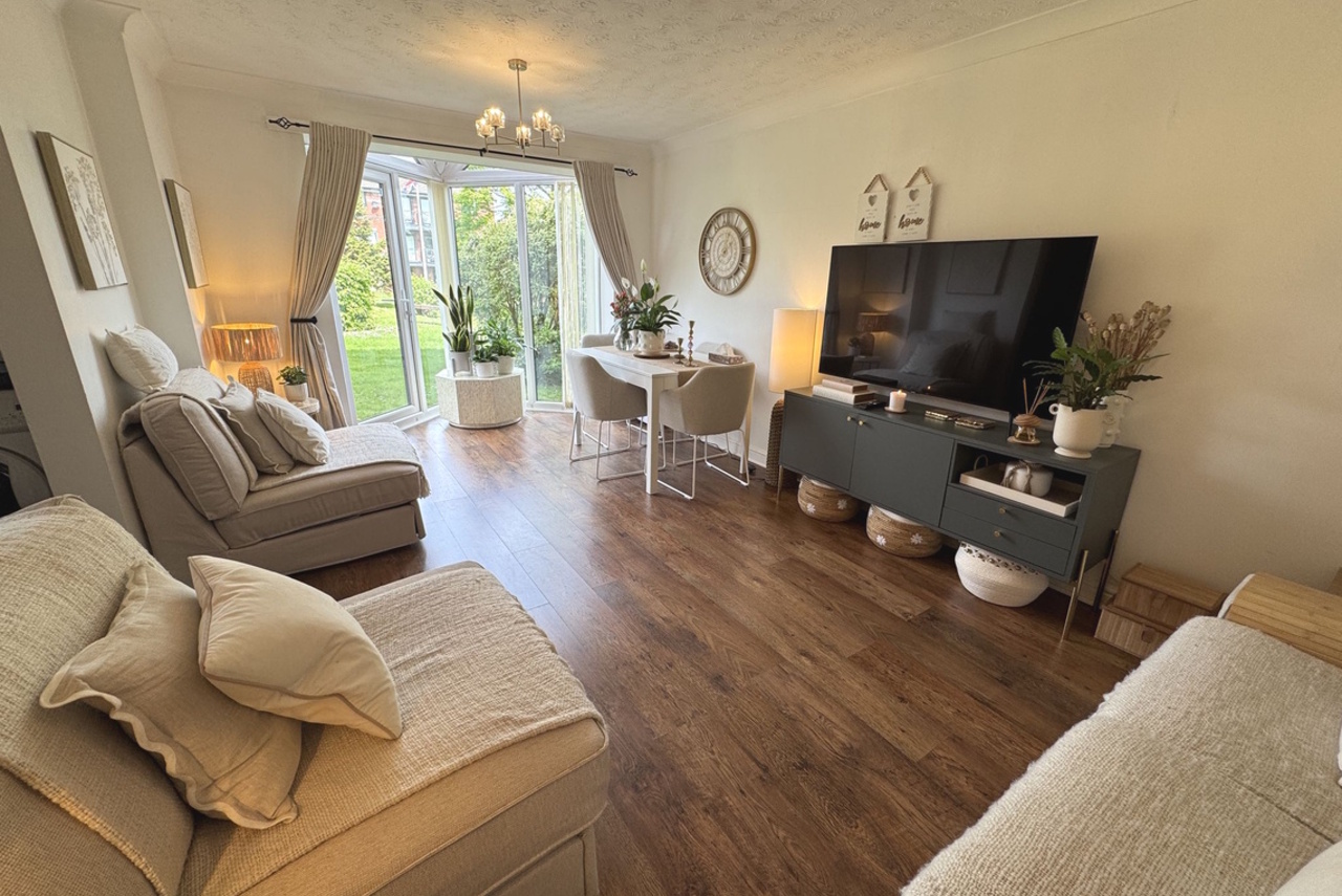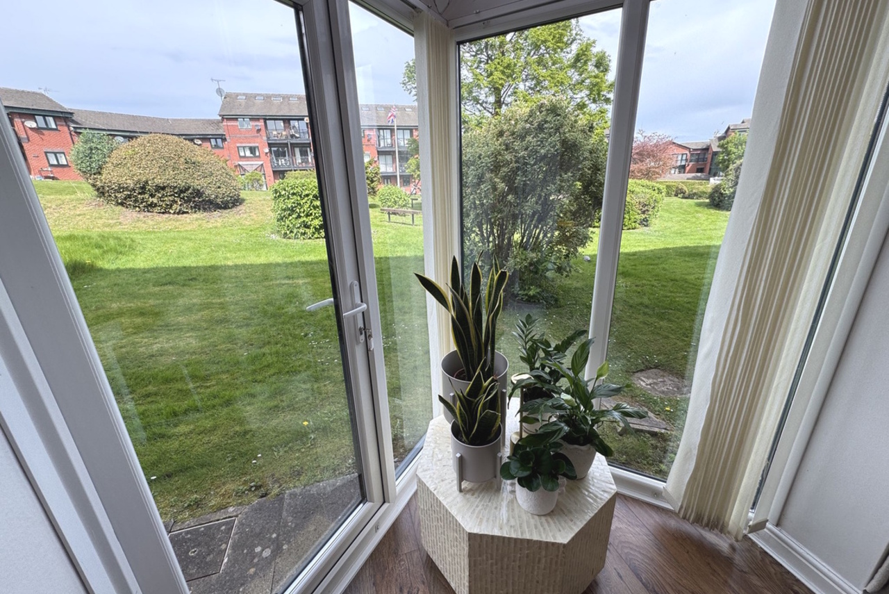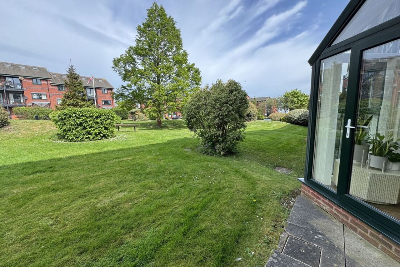 Glazed door from the Living Room provides access to the maintained communal garden areas. Flagged patio area.
