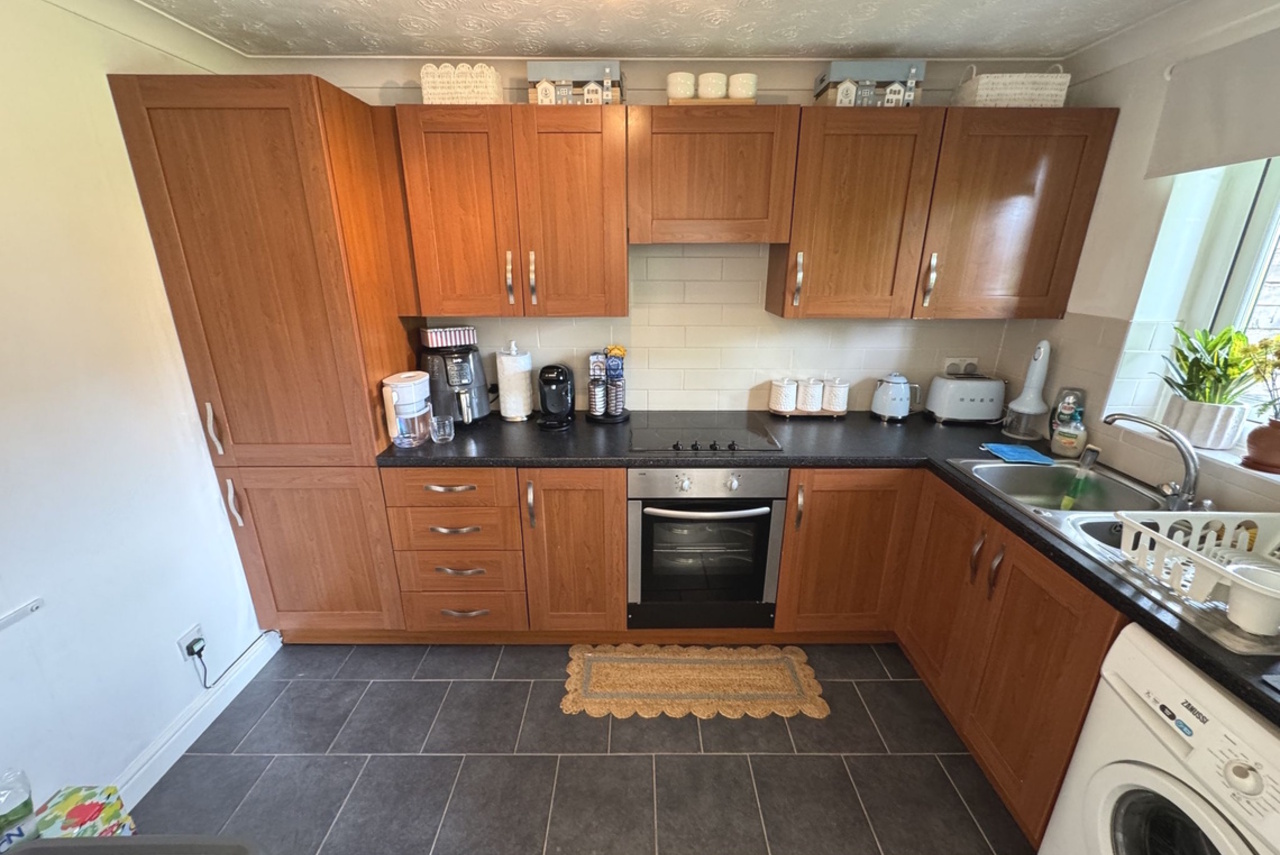 uPVC double glazed window. Fitted with dark coloured worksurfaces to two sides together with contrasting woodgrain effect base, wall & drawer units. Single drainer stainless steel sink unit with mixer tap. Recess with point for washing machine. Range of fitted appliances to include: Integrated fridge-freezer, single oven, electric hob inset to worktop with built-in cooker hood above. Space for breakfast table & chairs. Part tiled walls. Tiled floor.