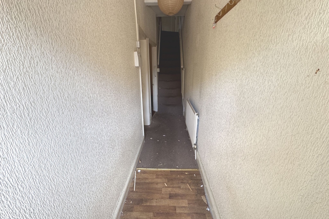With staircase off to first floor Landing. Central heating radiator. Burglar alarm control panel (system not tested for operation).
