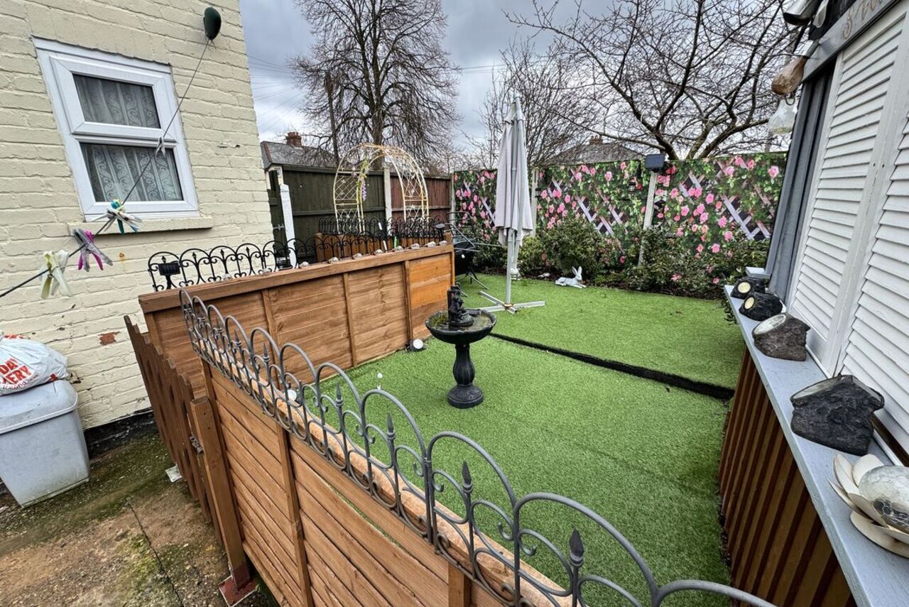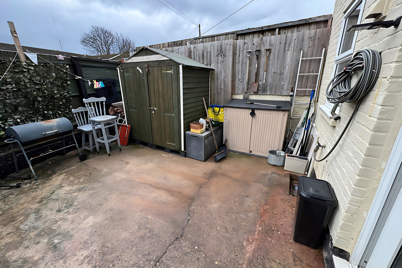 Enclosed yard with concrete surface. Exterior tap. Raised area with low level fencing. Boundary walls & fencing. Timber gate to side/front.
